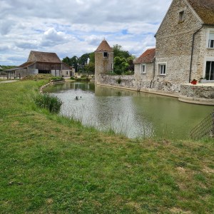 Une fois la forêt derrière, vous arriverez devant une ferme atypique avec des douves. Vous allez passez de hameau en hameau en quittant le GR 14 une première fois pour découvrir le village de Neufmoutier puis pour rejoindre le pont qui vous permettra de longer la voie LGV sur 1.5 km avant de vous retrouver de nouveau complètement sous le couvert forestier.