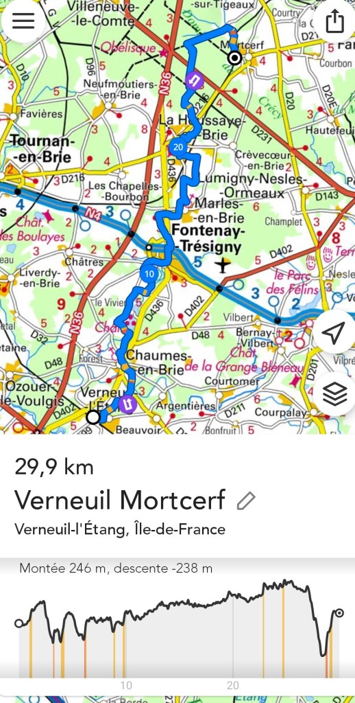 Après ces 6 km de foret un dernier passage à travers champs finira de vous achever surtout avec une petite pente qui vous fera un peu mal au jambes après 28 km. Vous longerez alors une route avant de reprendre un dernier sentier forestier qui partira sur votre droite et vous fera déboucher sur la gare de Mortcerf: bravo, vous êtes arrivés.