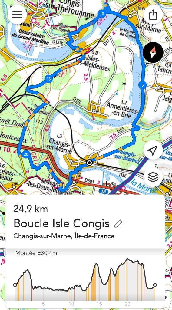 Une charmante balade qui a la particularité d’offrir des moments de dénivelé et des paysages très variés : champs, forets, villes, villages, routes sentiers, bords de Marne… Bref, 25 km qui ne sont jamais monotones