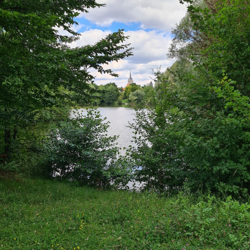Sortez par le coté rue de la gare et suivez le PR ( balise jaune) vers un rond point sur votre droite. Vous longerez alors une piste cyclable jusqu’à longer une étendue d’eau. Vous sortez peu à peu de la ville, en passant près d’un deuxième plan d’eau.