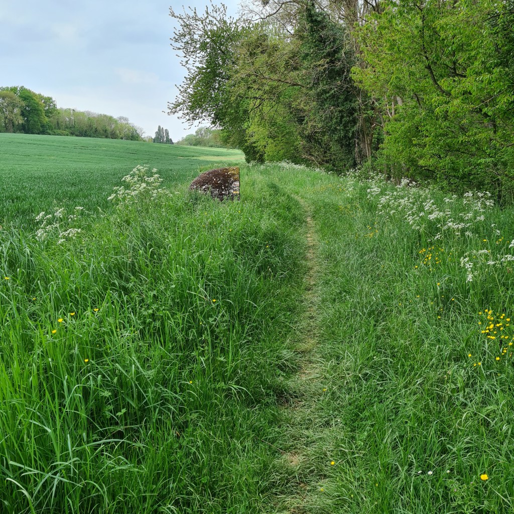 À la sortie de la forêt vous pouvez suivre le GR tout droit pour faire ensuite une boucle autour d’un champ pour vous diriger vers Montceau les Meaux. J’ai pris le parti de couper grâce un sentier herbeux en pente sur la droite juste avant la fin de la forêt permettant d’éviter cette boucle en restant sous couvert. Au niveau du KM 9 ce sentier vous permet de prendre un nouveau GR, le 14. Suivez le jusqu’à arriver à Montceau les Meaux.