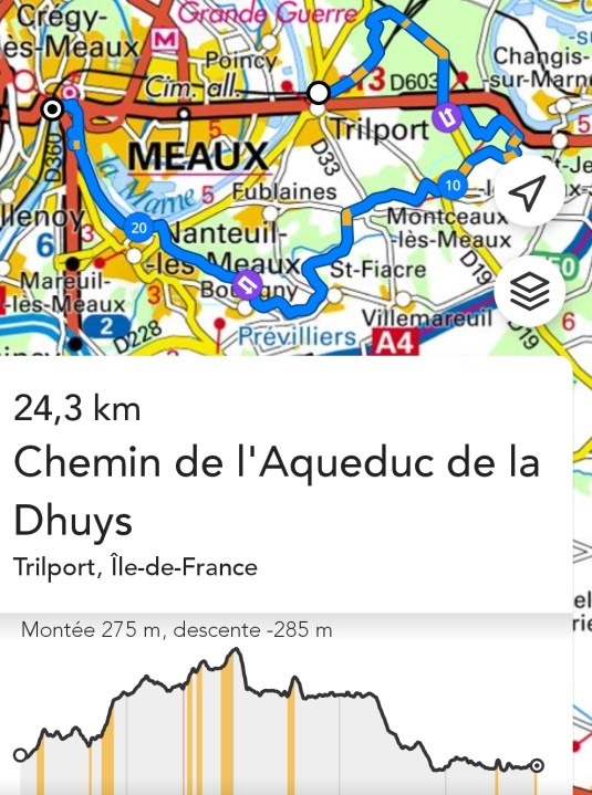 Une fois cette étape passée restez sur le GR pour traverser le village en descente. Sur votre gauche un sentier, c est de nouveau l’aqueduc de la dhuys. Vous allez rester longtemps dessus. Environ 6km jusqu’à Boutigny. Ce tronçon est surtout champêtre avec un beau point de vue et des éléments notables : lavoir, source, haras, vergers. C est vraiment un beau moment. Si la fatigue vous gagne coupez vers Trilport: les jolis bords de Marne et une gare vous attendent ( voir le lien au dessus ^)