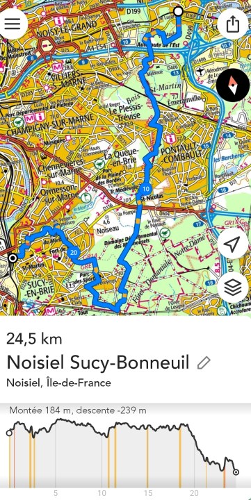 Sur ce trajet, j’ai choisi de faire une boucle autour de Noiseau. Vous pouvez, si vous le voulez, l’éviter et gagner ainsi 5 Km, c’est selon votre forme. Si vous suivez ma trace, quittez le GR vers l’Ouest (droite) au KM 12 jusqu’au chemin de la Gueule noire sur votre gauche, suivez-le et continuez toujours vers le sud jusqu’à arriver au club hippique de la porte de Tresigny au KM 15.
