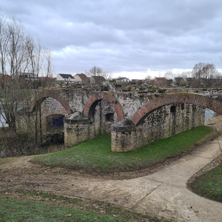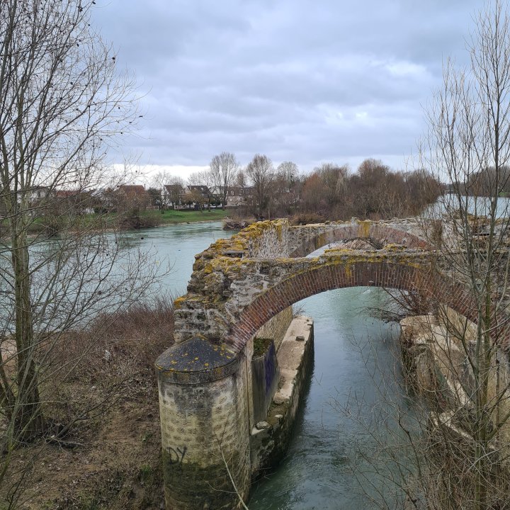 Une fois au canal qui permet aux péniches d’éviter le barrage de Noisiel, prenez à gauche vers l’Est et marchez jusqu’au 1er pont. Traversez le pour arriver dans un petit parc. Face à vous la Marne et le moulin en ruine depuis plus de 100 ans de Chelles.