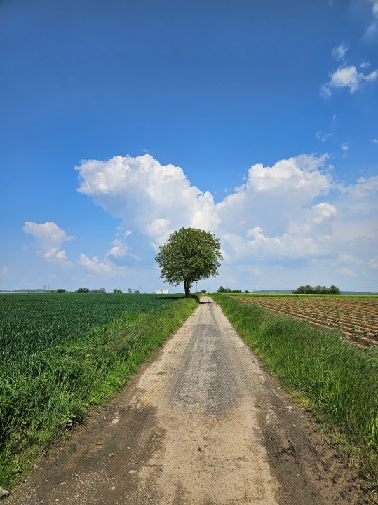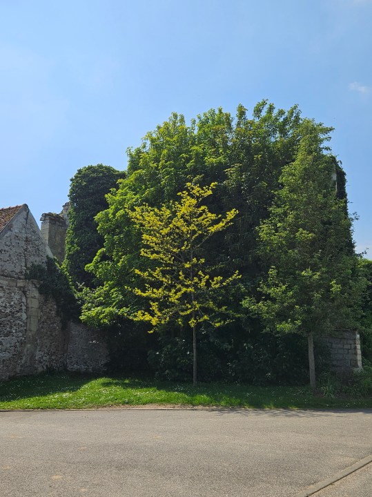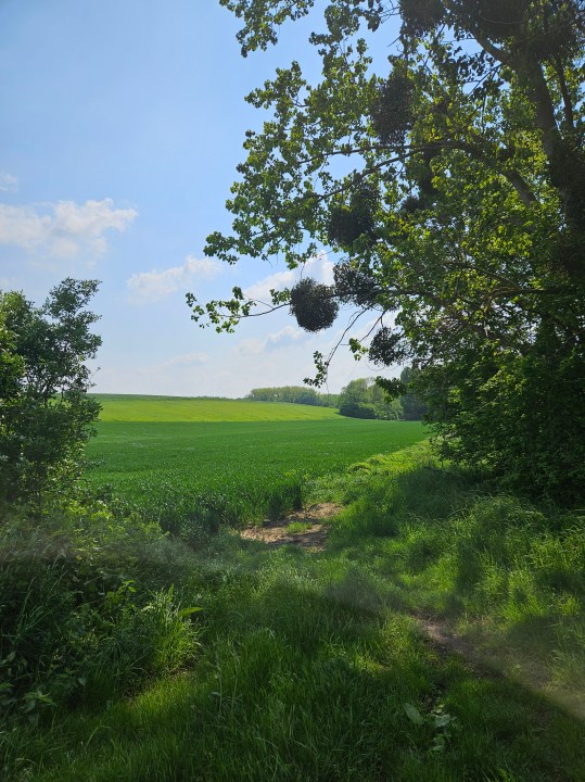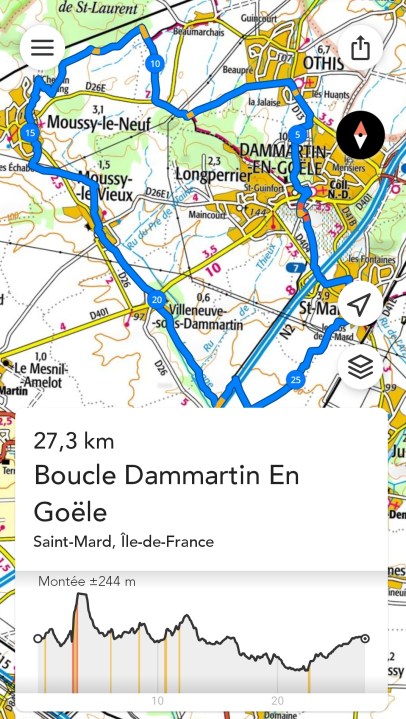 Allez jusqu’à l’église. Prenez ensuite à gauche. Pour l’anecdote, c’est un sentier décrit par Gérard de Nerval dans son ouvrage Sylvie. Après avoir quitté la ville, continuez tout droit sur un chemin balisé en jaune jusqu’à longer une forêt. Vous êtes de nouveau sur le GR 1, suivez-le jusqu’à une départementale. Une ferme est en contrebas sur votre gauche (est) avec ses silos: c’est votre nouvelle destination.