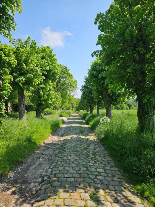 Après une dernière pause sur l’aire de pique nique à l’entrée du village, traversez-le en suivant les balises vers le sud. Vous arriverez alors sur une magnifique route pavée qui vous fera peu à peu pénétrer dans un bois.