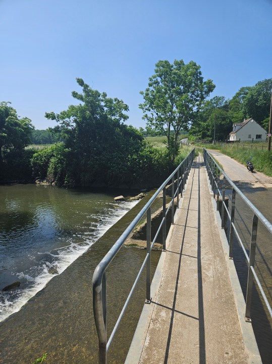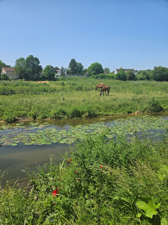 Une fois la pause terminée, remontez jusqu’au château et prenez sur la gauche (est). Traversez le village et quittez le PR pour remonter vers le Nord. Vous allez déboucher sur un autre gué au niveau de champs avec des chevaux si vous avez de la chance.