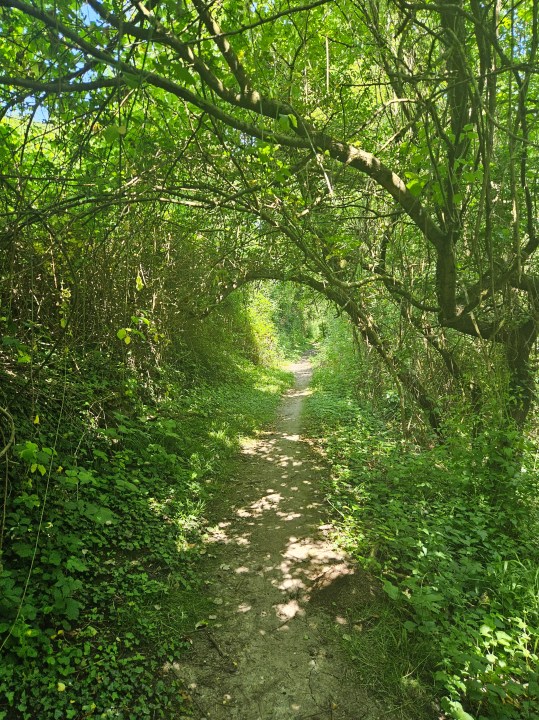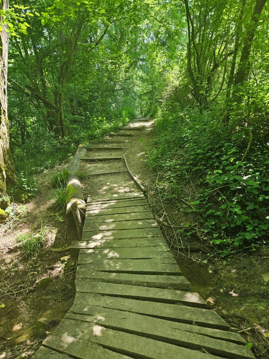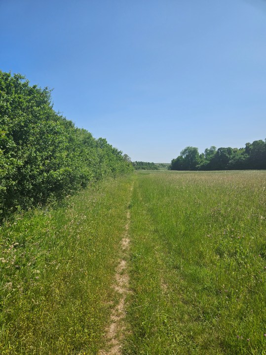 Continuez jusqu’à voir un sentier sur votre gauche (est). Prenez-le et quittez le pr. Vous longerez des sous-bois et des champs jusqu’à arriver au bois d’Évry. Ici, reprenez le sentier PR vers l’est. Au fond sur votre gauche vous verrez l abbaye de Venelle. Continuez jusqu’à traverser une passerelle.
