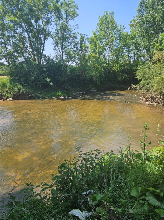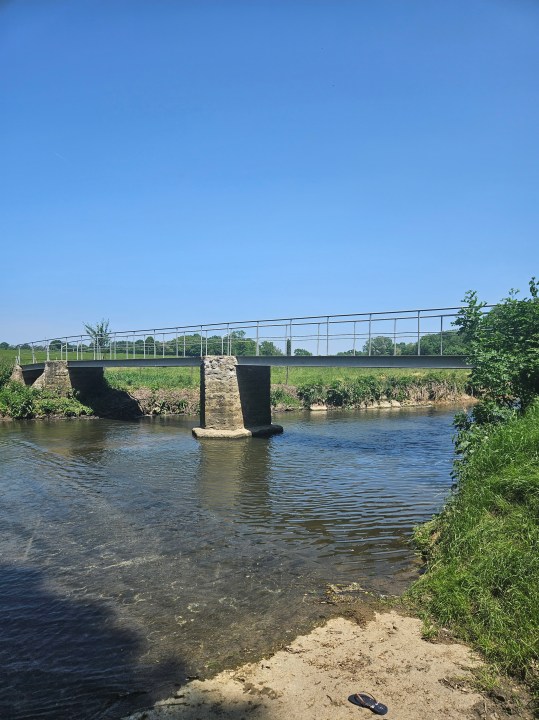 Si vous avez pris vers le sud vous passerez alors sur un magnifique petit pont pour déboucher dans une zone de champs. Suivez le PR vers le sud et regardez sur votre gauche (est) l’Yerres est là. Pour traverser, vous n’avez pas le choix, vous allez devoir mettre les pieds dans l’eau. Une pause séchage sur la pente herbeuse au soleil en face s’impose.