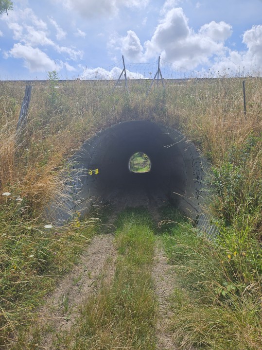 Prenez à droite vers le sud. Vous serez alors sur un sentier agricole que vous allez suivre jusqu’au km 7.5. Laissez vous guider par les balises jaunes. Le paysage est dégagé, vous ne pouvez pas vous tromper. Regardez sur votre gauche, en contrebas, un village est visible au sud, c’est là ou vous devez aller. C’est le hameau de Rutel. Vous allez traverser une route avant d’y accéder. Continuez votre chemin jusqu’à arriver à un passage sous une autoroute. ( peut être inondé attention !!)