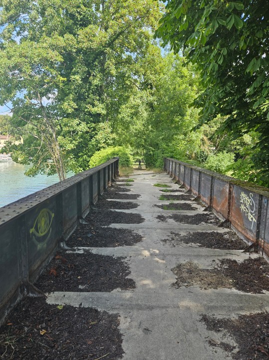 Sortez de la gare et prenez vers l’ouest sur votre gauche jusqu’à arriver sur les bords de Marne, ce n’est pas la partie la plus intéressante. Arrivé au pied du pont, vous avez le choix, soit prendre à gauche (sud) pour longer la rivière, soit monter sur le pont. Au milieu de ce dernier, un escalier vous mène sur une île boisée calme. Traversez cette île jusqu’à trouver une passerelle sur votre gauche qui vous ramène sur les rives de tout à l’heure. Je suis déjà passé quelques fois dans ce coin: