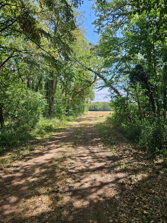 Vous êtes alors sur un magnifique chemin forestier très calme, avec des pinèdes : le bois de la grande vente. Continuez jusqu’à croiser une départementale. Traversez-la et continuez jusqu’à un croisement de sentiers; c’est un bon lieu pour faire la pause midi, un arbre isolé vous fourni un beau coin d’ombre.